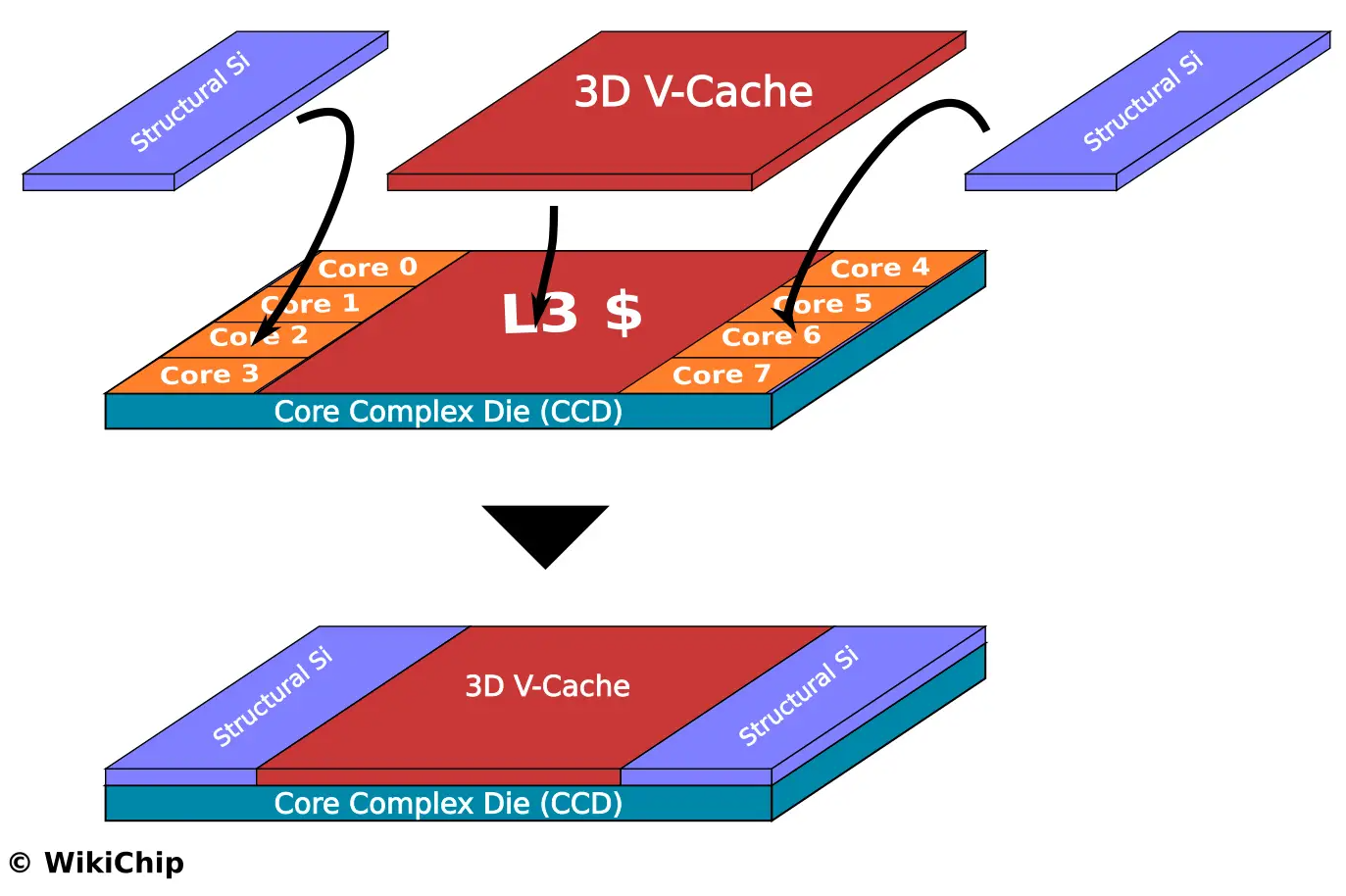 3D V-Cache is een technologie waarmee extra cachegeheugen op de processor kan worden gestapeld, bovenop de bestaande cachegeheugens. Dit extra cachegeheugen is veel sneller en efficiënter dan traditioneel cachegeheugen en maakt gebruik van een 3D-stapeltechnologie. Dit betekent dat de extra cachegeheugens als een soort van toren op de bestaande processor worden gestapeld, waardoor er meer geheugen kan worden opgeslagen zonder extra ruimte op de chip in beslag te nemen. De Ryzen 9 7950X heeft 64MB aan L3 Cache terwijl de Ryzen 9 7950X3D 128MB aan L3 cache heeft.